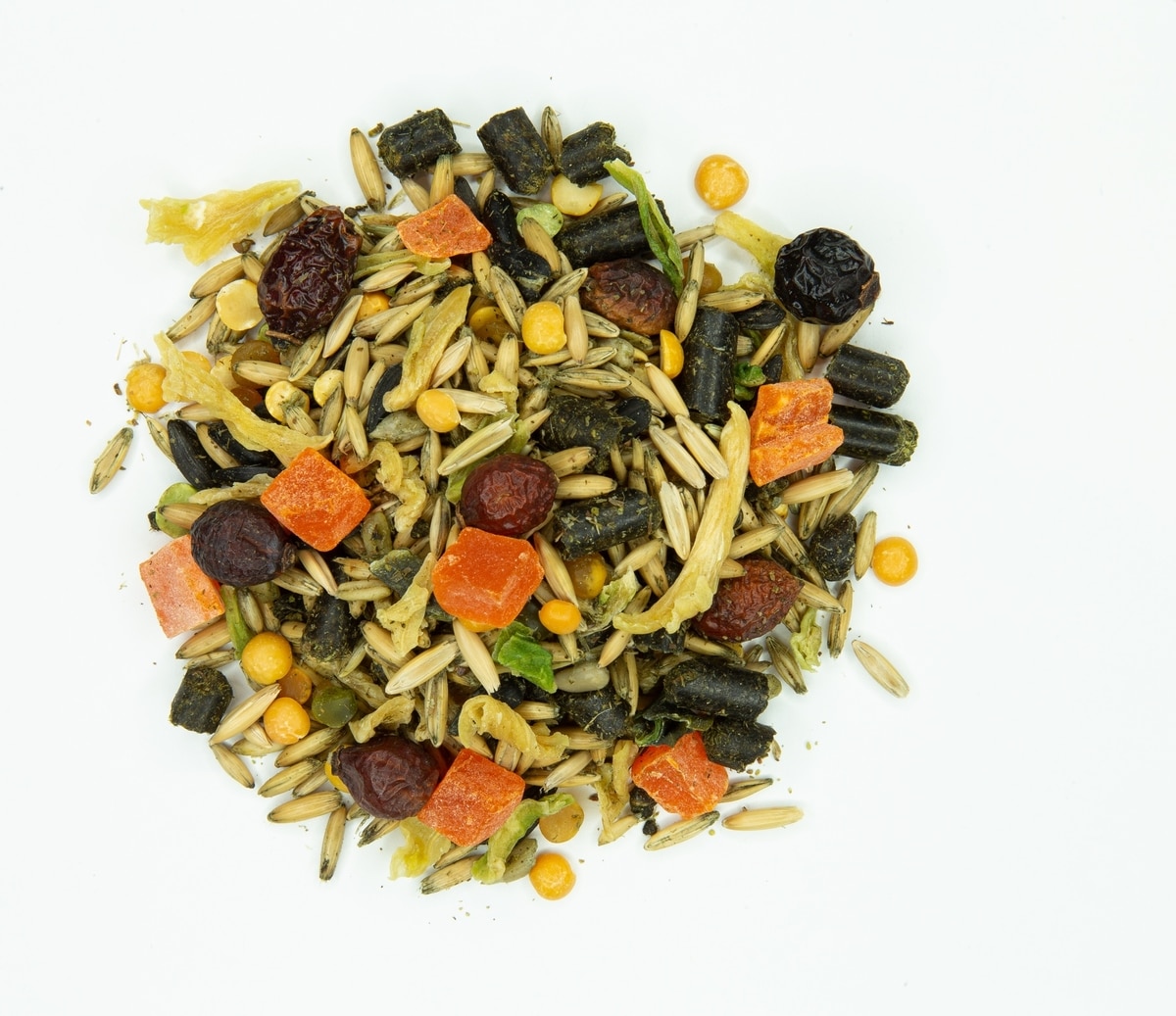 • Includes whole oats, timothy hay pellets, alfalfa hay pellets, sunflower seeds, green peas, yellow peas and rice bran oil.