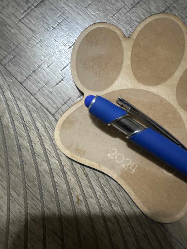 - Design features a paw print-shaped wood carving with room for customization.