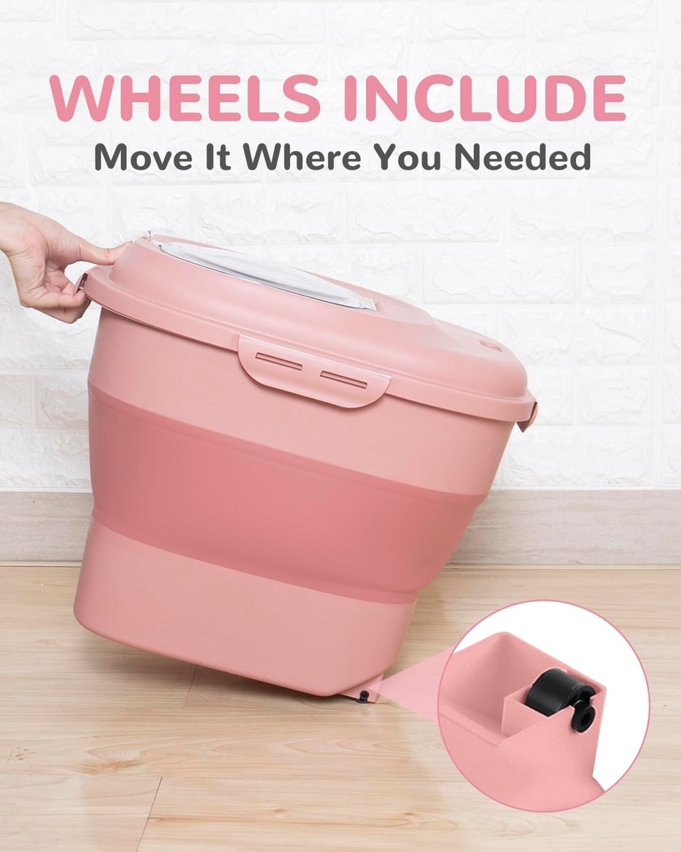 The container’s large capacity can store up to 35 pounds of dry pet food.
