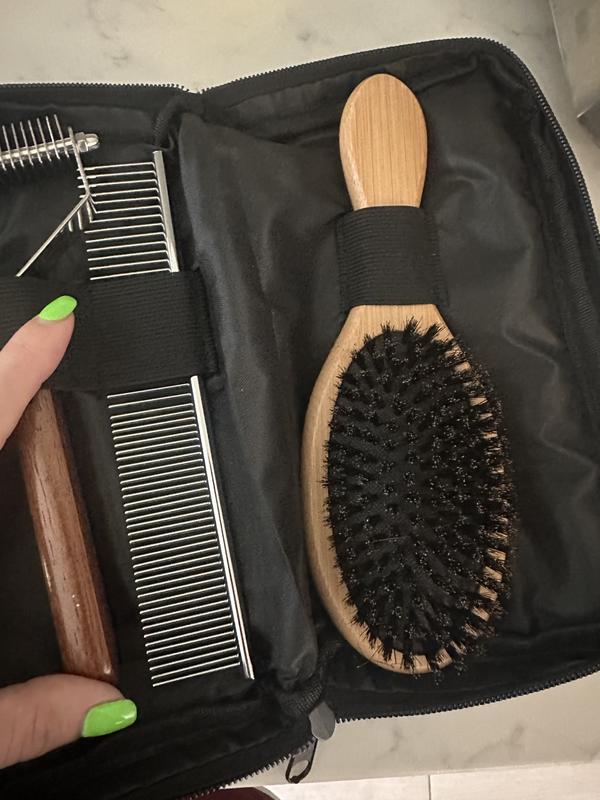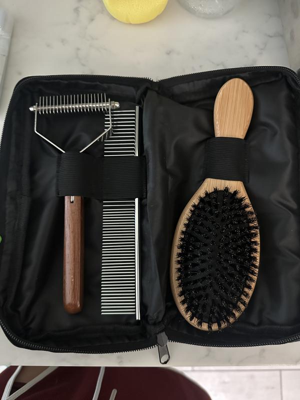 Really nice quality grooming tools. The comb was just the right width of teeth. It easily got through my long haired dachshund's hair whereas other combs have gotten tangled! I used the bristle brush for my chihuahua mix and undercoat rake for my mom's terrier. It was great to get a variety of tools so I could groom all of our family's dogs.