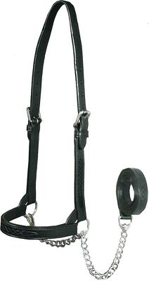 Derby Originals Premium Flat Fancy Stitch Leather Cattle Show Halter & Chain Lead, Black, Large