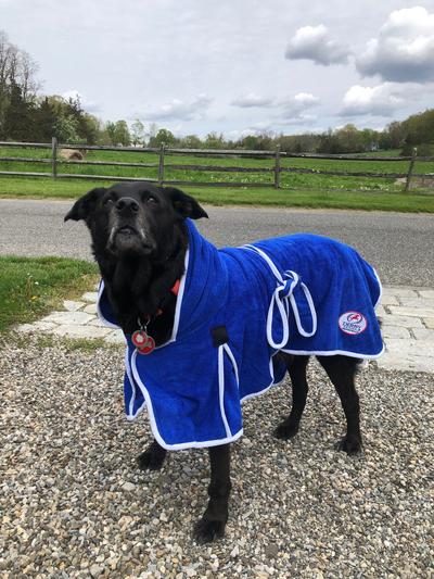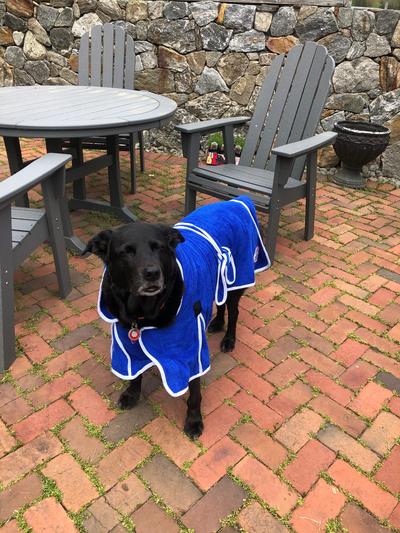 Great robe for my arthritic senior dog. He gets a bad chill after swimming and this did the trick! It looks adorable also. I wish it was in terry cloth but the