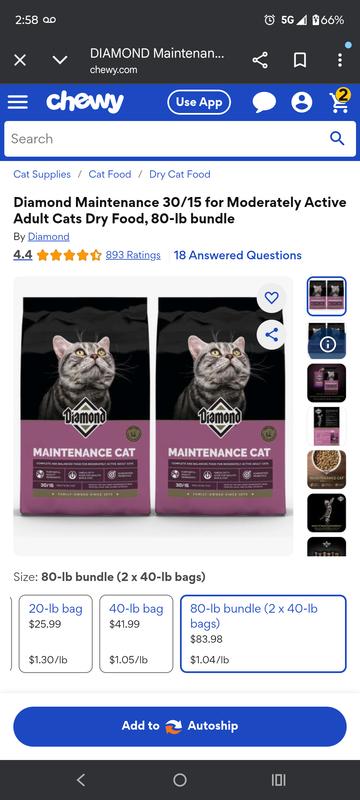 - Diamond Naturals Indoor Formula Dry Cat Food, 18-lb bag$33.99 Chewy Price$32.29 Autoship PricePromo, New Customers Only: Spend $49+, Get $20 eGift Card