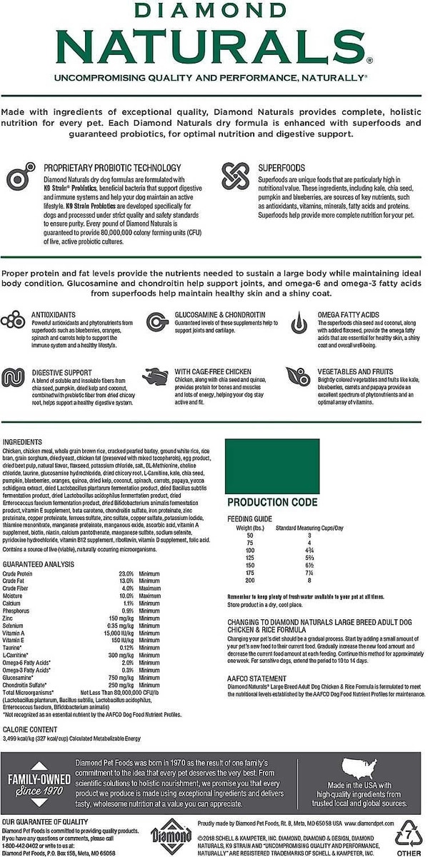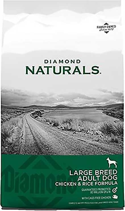 Give your large breed adult dog the superior nutrition she deserves! Each purchase comes with Diamond Naturals Large Breed Adult Chicken & Rice Formula Dry Dog Food, 40-lb bag & Diamond Naturals Chicken Dinner Adult & Puppy Canned Dog Food, 13.2-oz, case of 12. Diamond Naturals Large Breed Adult Chicken & Rice Formula Dry Dog Food is enhanced with superfoods and guaranteed probiotics to support your furry friend’s development and overall health. This large breed adult dry dog food recipe is made with real cage-free chicken, whole grain brown rice and real fruit and vegetables including kale, blueberries and coconut! It provides your furry friend with protein and minerals, along with omega fatty acids to help promote healthy skin and a shiny coat, plus antioxidants for overall nose-to-tail well-being. Diamond Naturals Chicken Dinner Adult & Puppy Canned Dog Food features high-quality, delicious chicken as the first ingredient, and plenty of protein to help support lean, active muscles. Made with a holistic approach to pet health, it’s also loaded with field veggies and superfoods for powerful antioxidants, plus vitamins and minerals for overall well-being in dogs of all sizes and ages. with real meat and whole-food ingredients in each tasty bite, it’s the flavor and nourishment dogs love—and you can feed it as a complete meal on its own or as a topper or mix-in for kibble.