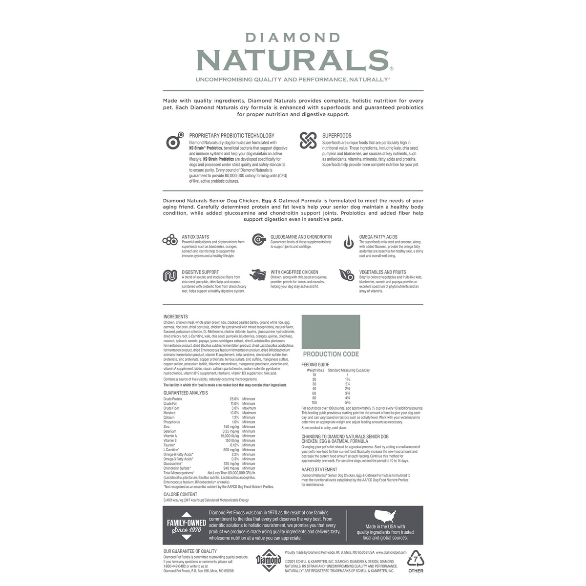 Diamond Naturals Senior Dog Chicken, Egg & Oatmeal Formula is formulated to meet the nutritional levels established by the AAFCO Dog Food Nutrient Profiles for maintenance.