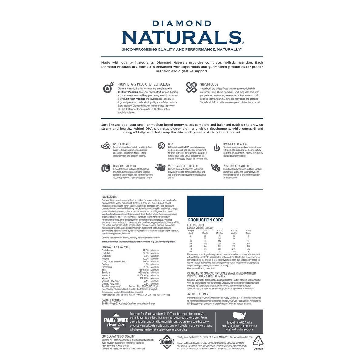 Diamond Naturals uses the highest quality ingredients and manufactured in America in state-of-the-art facilities. This formula uses some ingredients that are not USA sourced, like flaxseed and barley, both which originate in Canada and dried chicory root from Belgium. There are ingredients such as folic acid and taurine that can only be sourced out of China.
