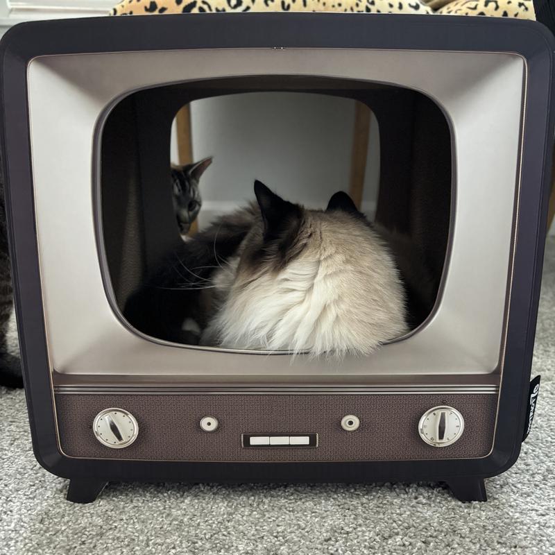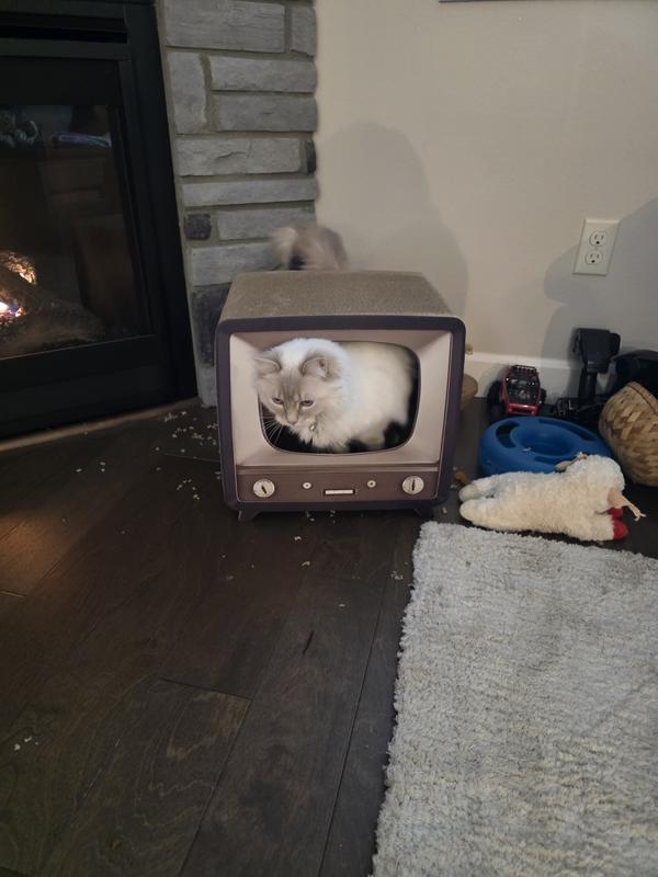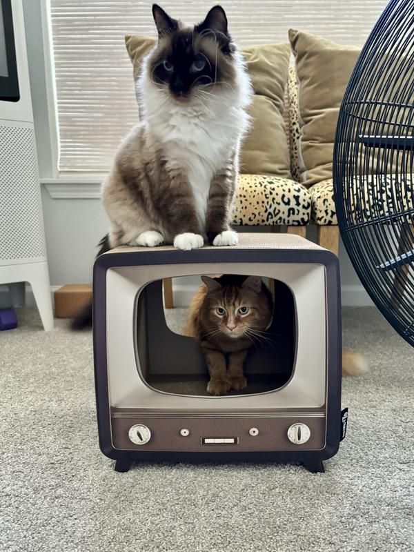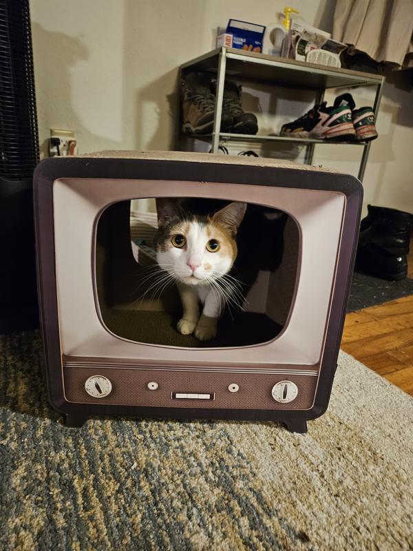 My cats and human fam have been huge fans of the District 70 mix tape and sardine tin scratchy boxes; the TV is similarly well-constructed (the other two boxes we got lasted for a year each with three very active cats, two of whom are BIG) but I wasn't prepared for how small the TV was in comparison to the previous two scratchers. None of my guys (all adults) want to go in, though they enjoy scratching it and sitting on top. And like the other two boxes, the design is charming. Get it if you have a teeny cat or kittens.