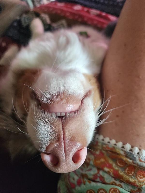 Hi. My name is Nubbin. I'm a 10 month old piebald miniature dachshund sun worshipper. I LOVE to go outside and sun my belly. Unfortunately for me, my little tummy is naturally light and pink. Mom limited my time in the sun so my little belly wouldn't get sunburned. Then she got Divine Canine sunscreen and now I can lie out in the sun a lot longer with my Divine Canine sunscreen on! It protects me from burning, moisturizes my skin, and smells good, too! It's also non-toxic. Please see my pictures and note how pink my belly is. That's its natural indoor color, so you can understand why my mom insists on safety first when I'm out in the sun. Thanks Divine Canine and Chewy!