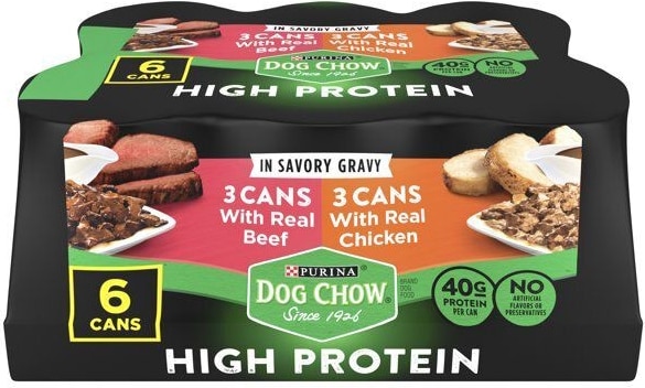• Purina Dog Chow high-protein dog food (40 g of protein per can).