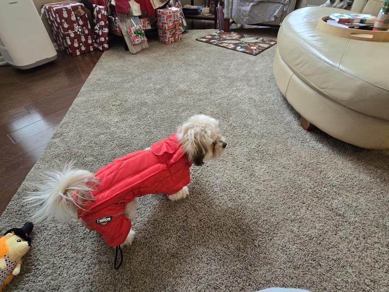 This jacket is designed to protect your dogs entire body in extreme conditions, with cinch straps on each leg and a covered leash slot.