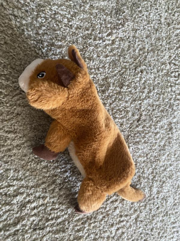he loves his cow it is a little large but he crunches and throws it .I think it is a winner