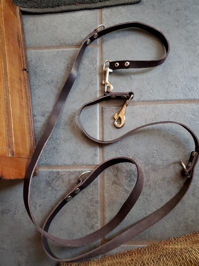 This broke within 10 mins of using. The hardware snapped. Returned it immediately and will not be buying again. The quality just isn't there, this leash is flimsy and feels cheap,even with the leather. I have a 65 lb staffie, love the flexibility of the 6way lead and prefer leather because of the hand feel and strength . We have had many over the years, made by different manufacturers. they are always at least 2-3 times more expensive than this one and have lasted. I guess you get what you pay for.