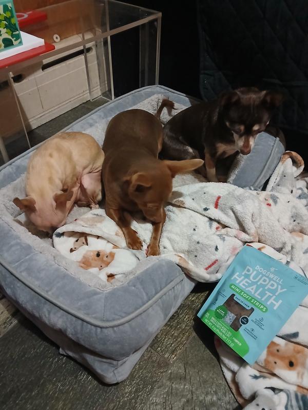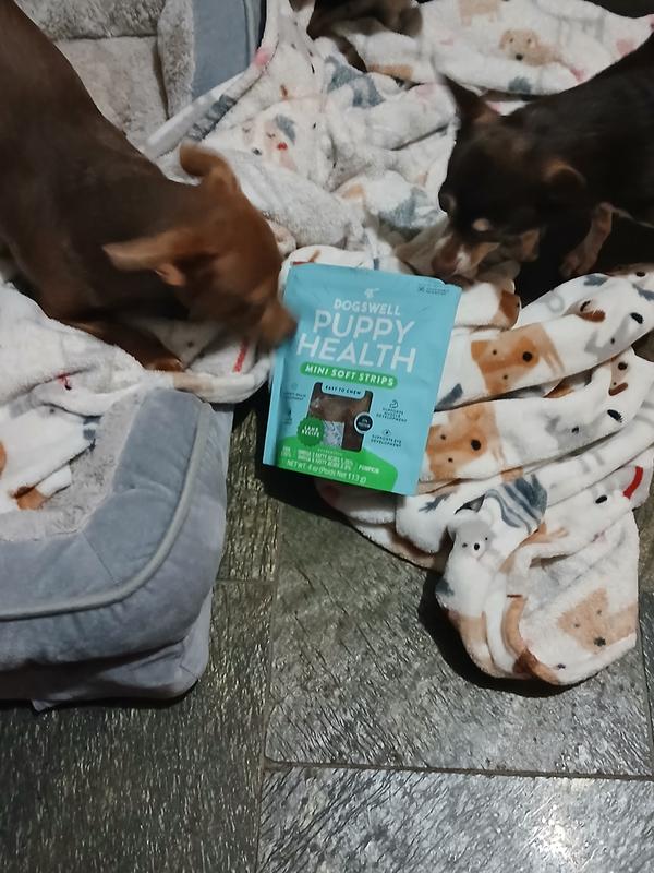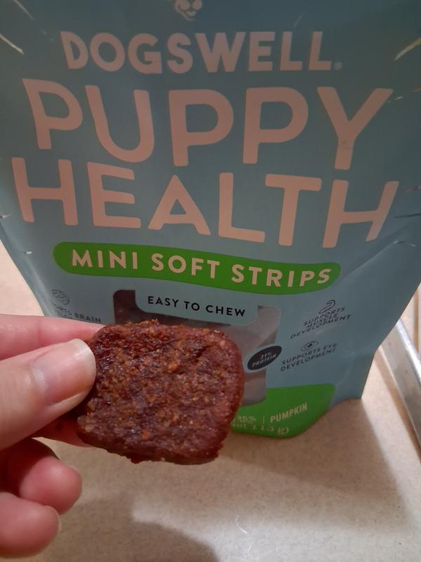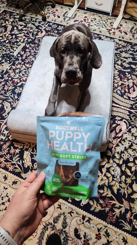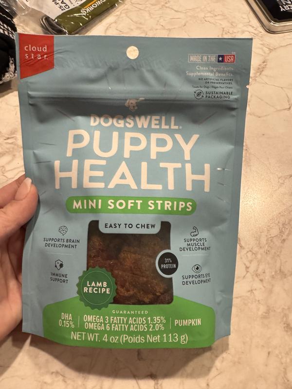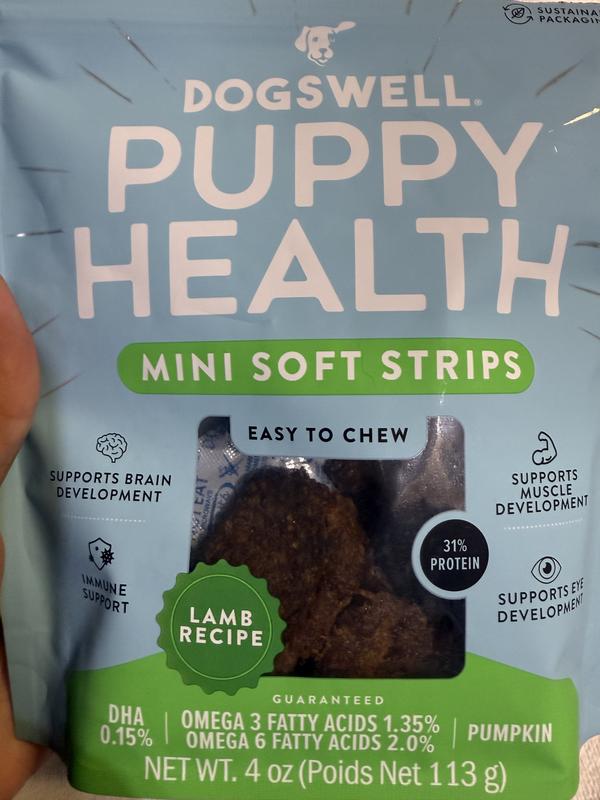 Made for Puppies Dogswell Puppy Health dog treats are high in protein from real lamb and they provide your new puppy with supplemental nutrients from DHA for brain & eye development, pumpkin to support digestive health, and omega 3 & 6 for healthy skin & shiny coat.