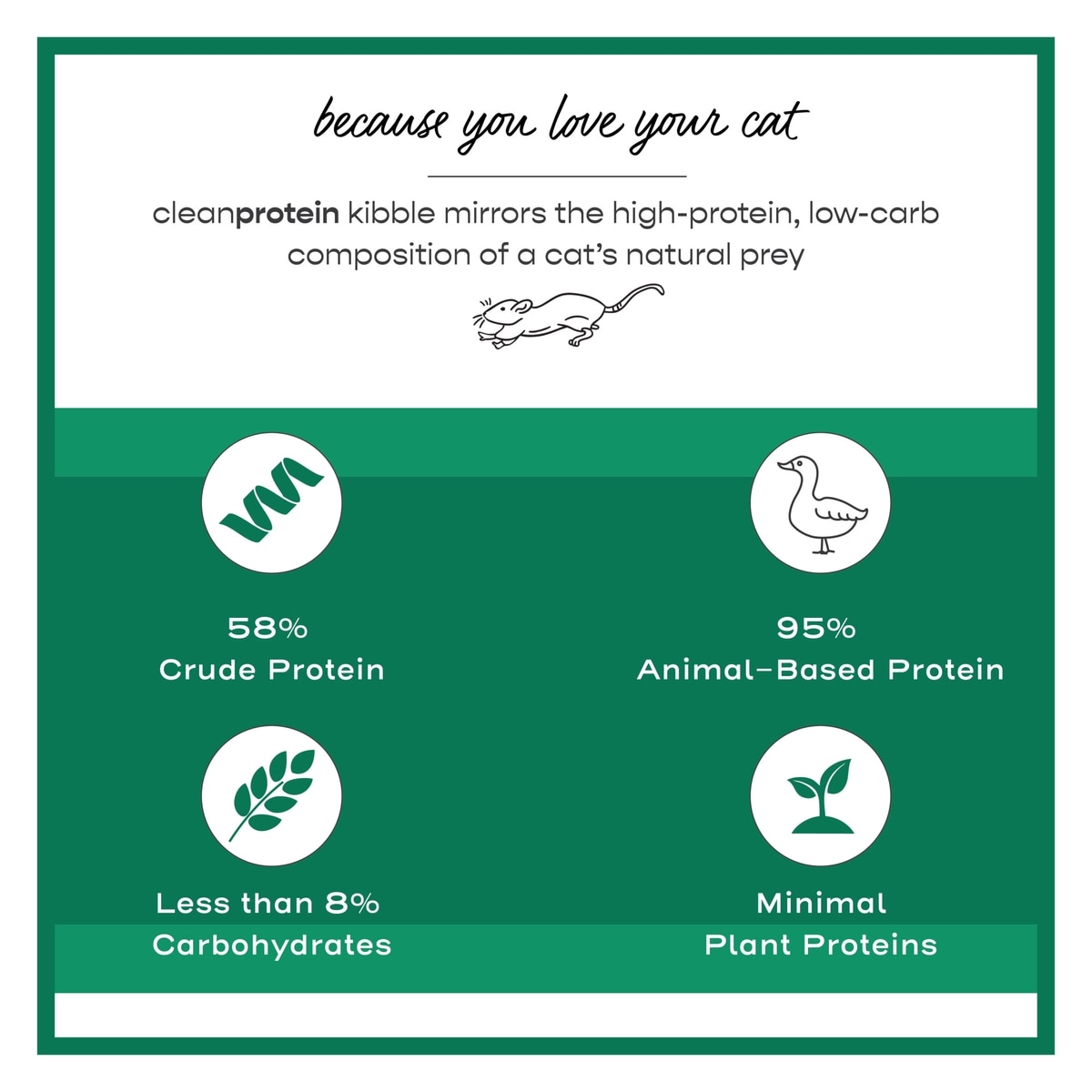 Dr. Elsey’s cleanprotein was inspired by the protein levels found in natural prey. By excluding plants commonly found in other cat diets, it has low oxalate to help ensure healthy kidney function and an active lifestyle.