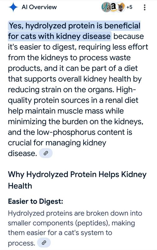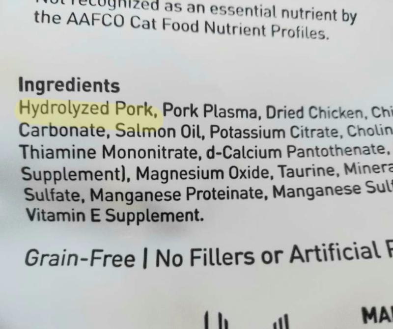 The first ingredient ( only the pork flavor) is Hydrolized Protein. This makes it easier for the body to utilize and absorb. It's also much easier on a cats kidney