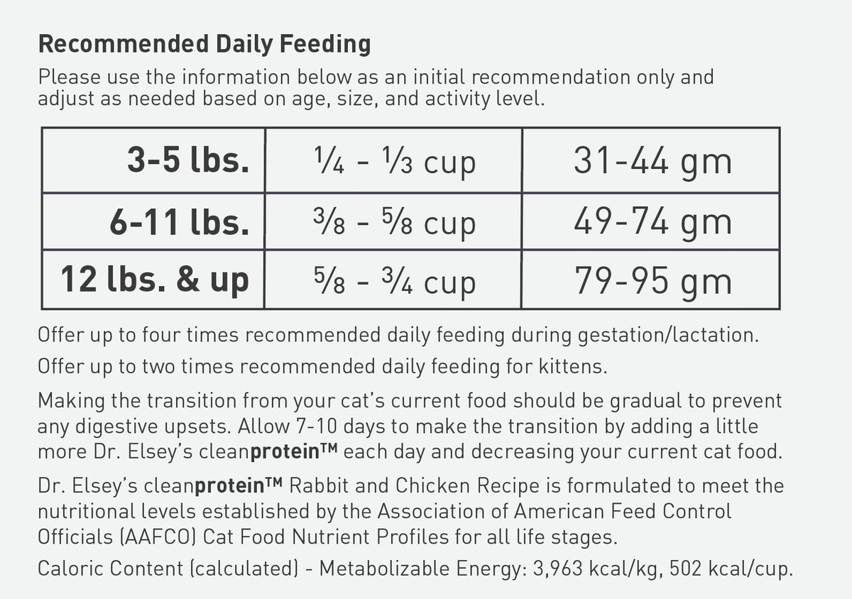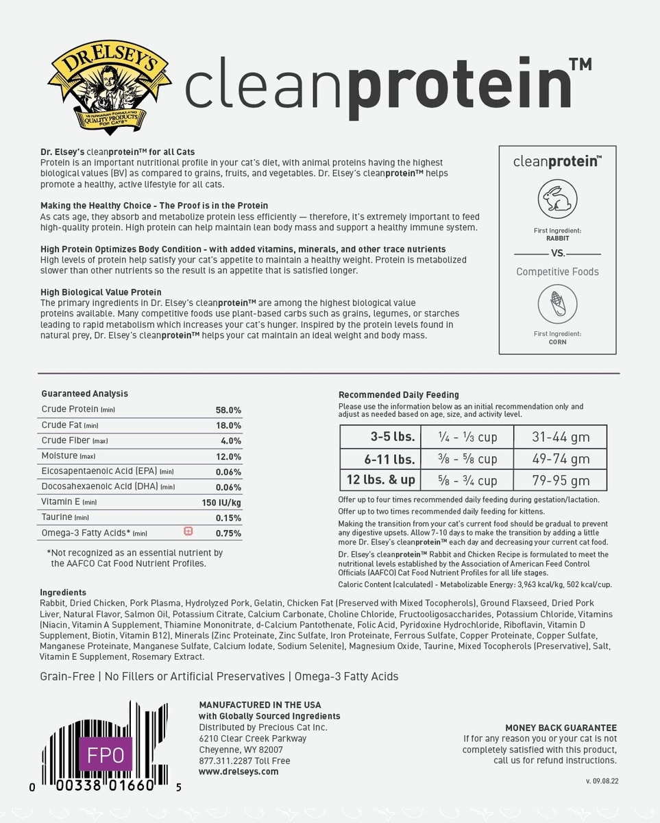 Protein is an important nutritional profile in your cat’s diet, with animal proteins having the highest biological values (BV) compared to grains, fruits, and vegetables. Dr. Elsey’s cleanprotein helps promote a healthy, active lifestyle for all cats.