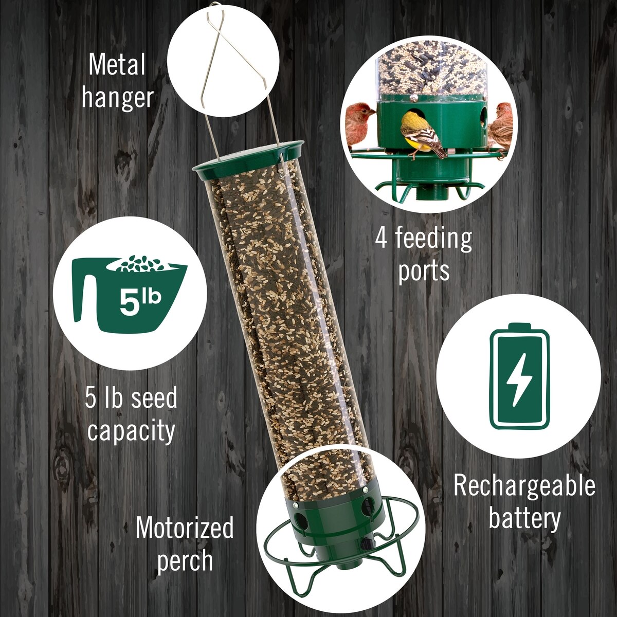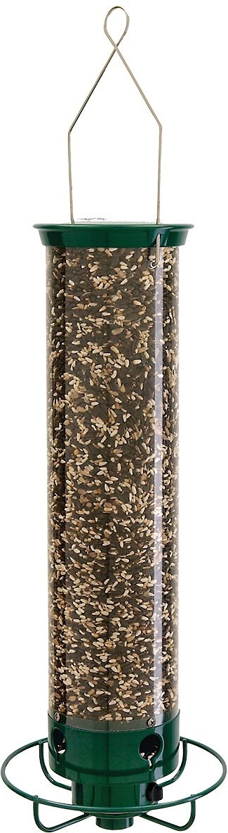 This feeder immediately spins when a squirrel lands on the perch to gently throw the intruder off. The feeder is too long and slippery for squirrels to climb to get to the seed ports.