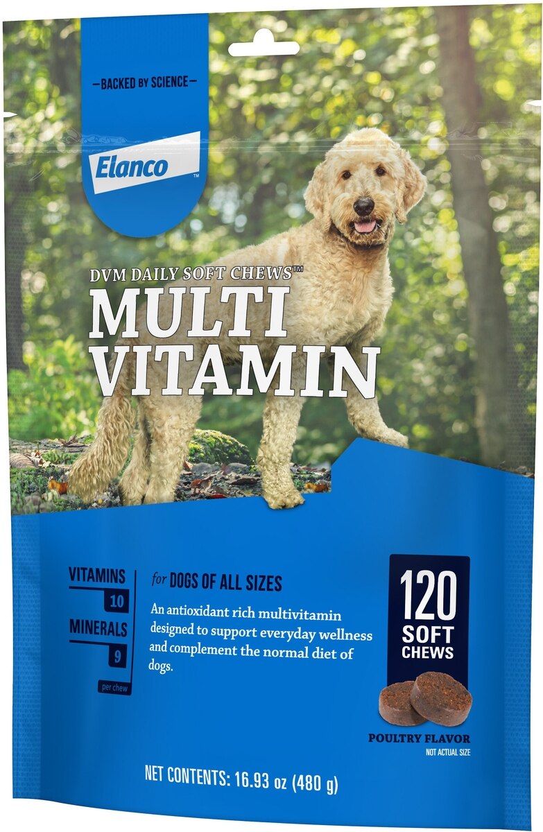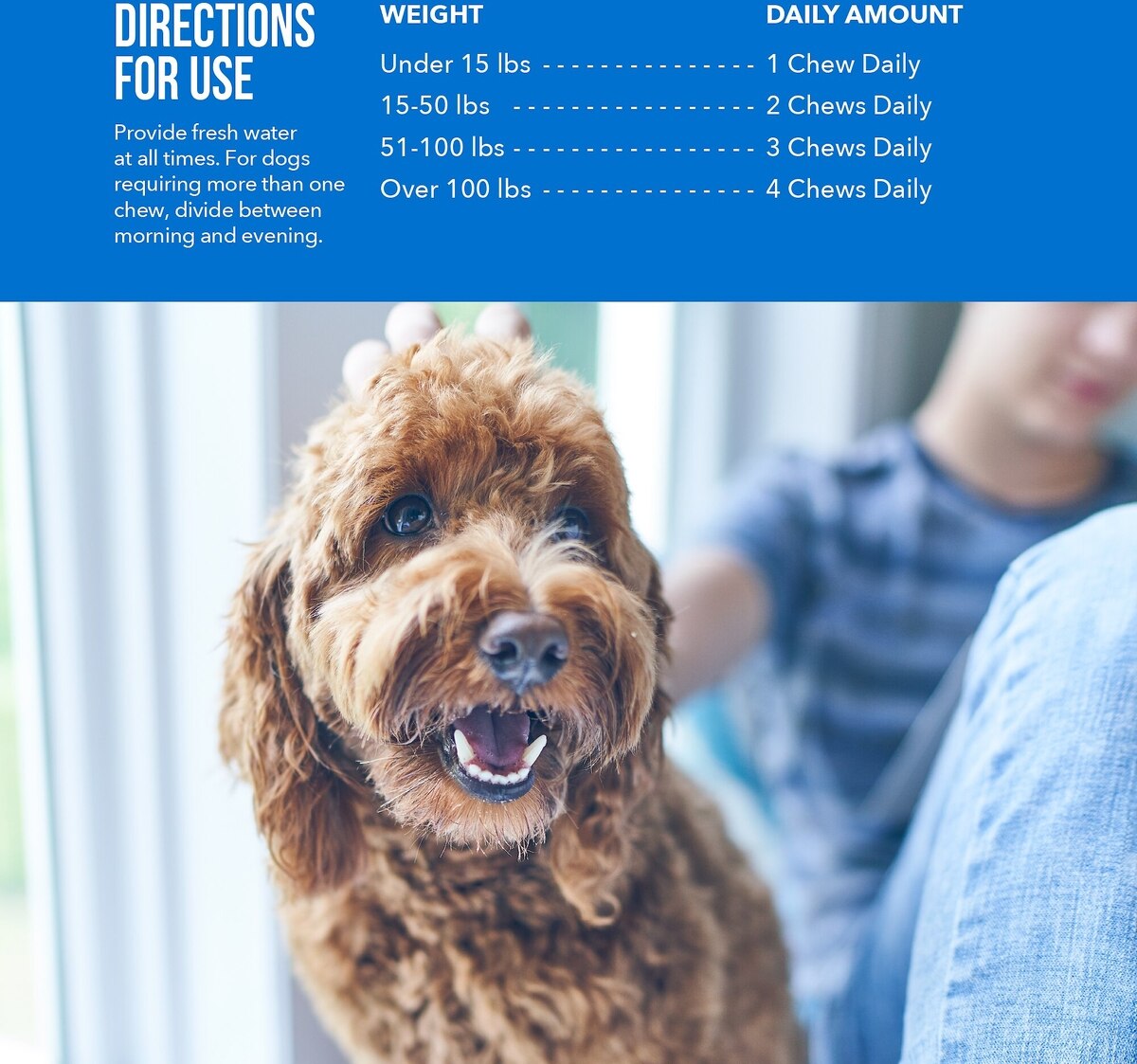 These daily dog vitamins are vet-formulated with turmeric, antioxidants, 10 vitamins, and 9 minerals to help support healthy digestion, energy, and immune and bone strength. Best of all, they come in a chicken-flavored soft chew that's easy to give.