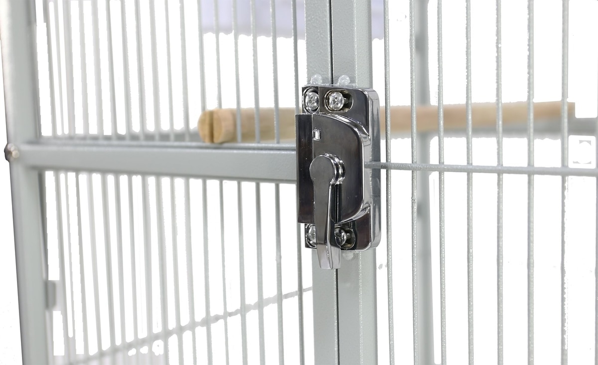 - This flight cage features vertical bars with a large front door, door lock, and two slide-up feeder doors.