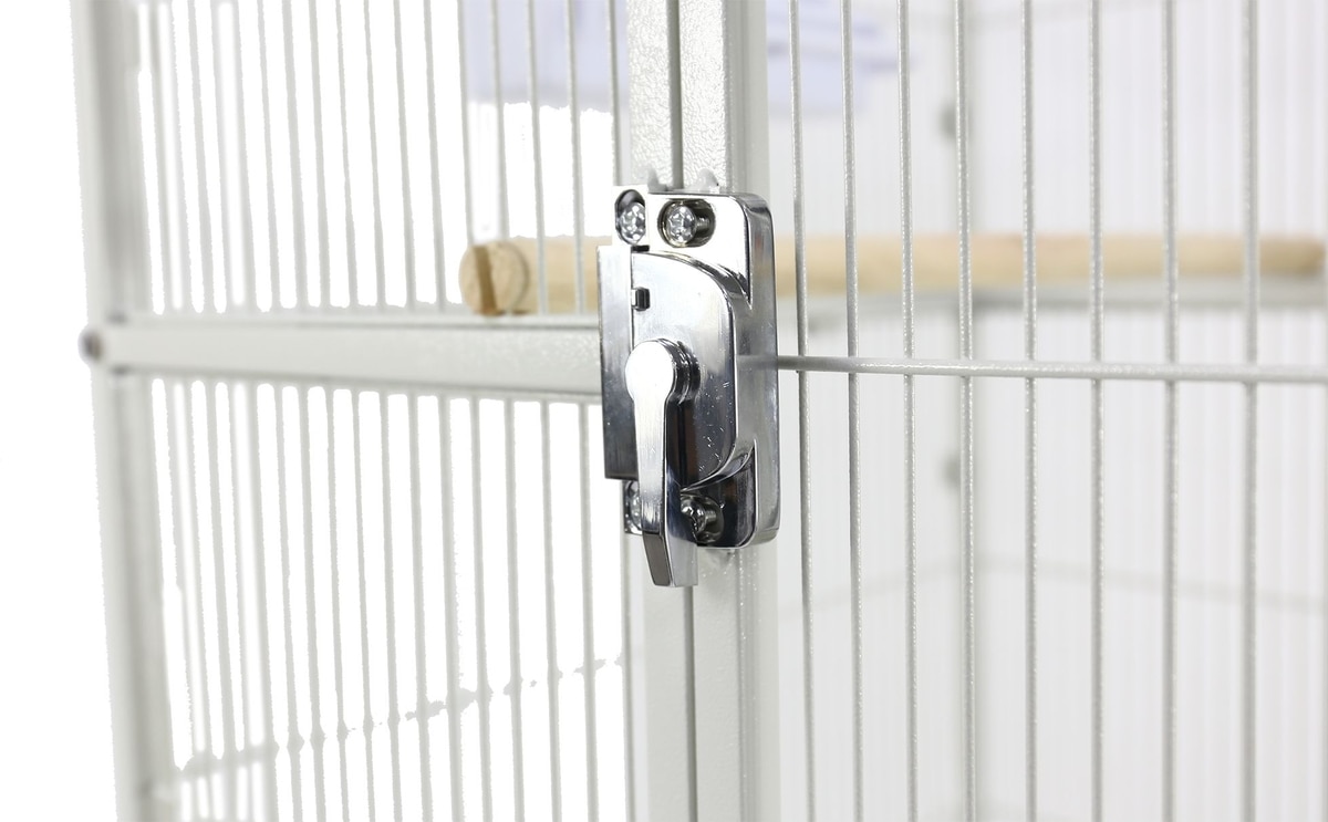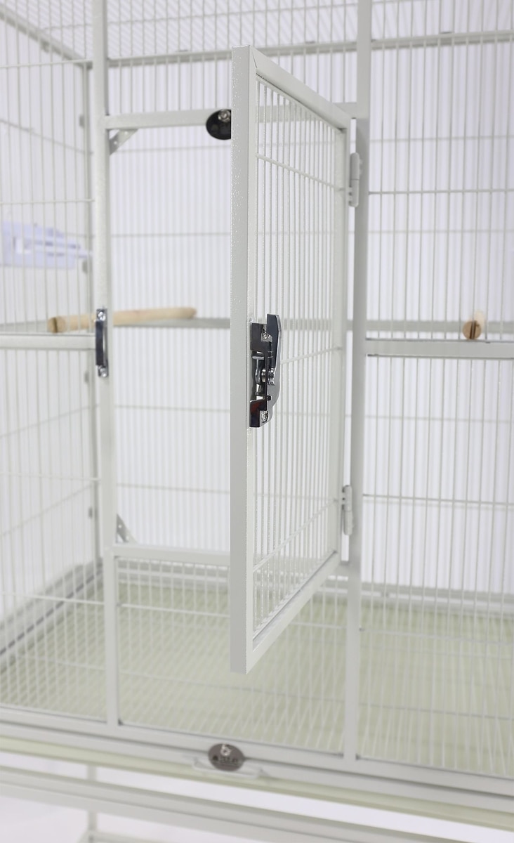 - This flight cage features vertical bars with a large front door, door lock, and two slide-up feeder doors.