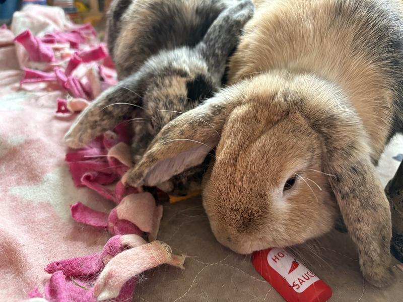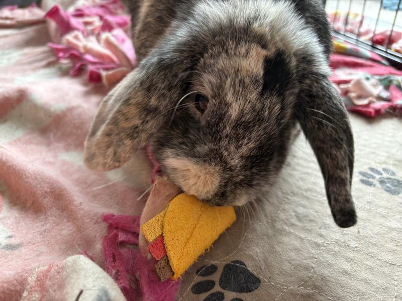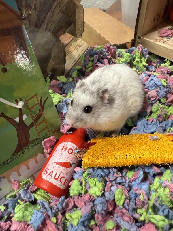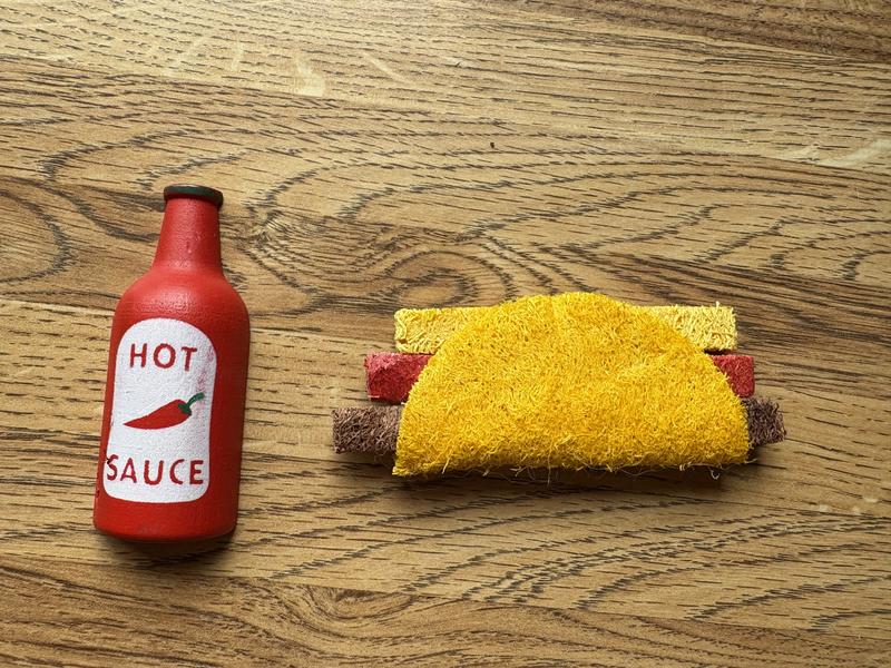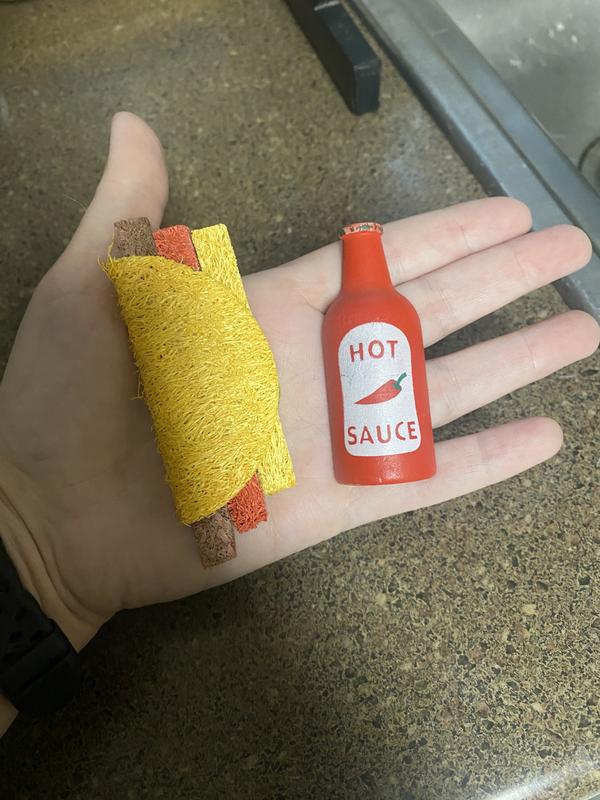 My rabbits really liked these toys. The hot sauce bottle is made from wood and the taco is made from loofah. They definitely enjoyed chewing the taco toy more than the hot sauce. The designs of both the toys are very cute.