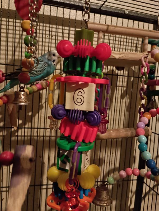 Great toy for entertaining my african grey. Good size and a lot of different type of textures for him to play with. He jumped right in and started chewing it.