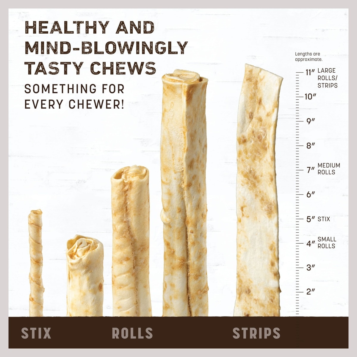 A Size For Every Chewer Pets should always be given the right size chew to use under close supervision. Stix are perfect for small dogs or cats. Rolls are the original long-lasting alternative to rawhide. Strips are a quick, tasty treat to chew on for dogs of all sizes.