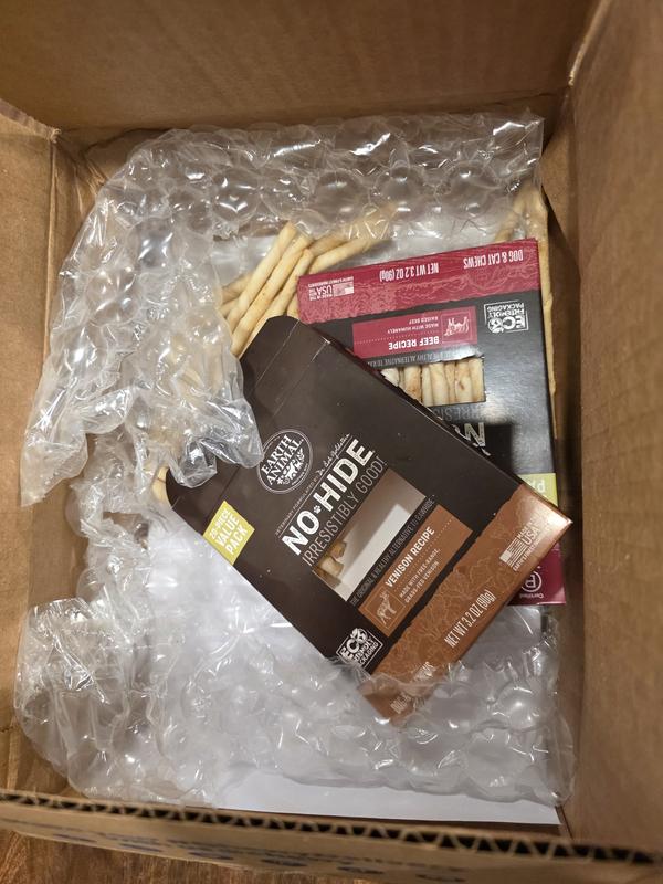 This was my first time purchasing this product, and I was really looking forward to it, but I ended up disappointed. Before ordering, I saw a few reviews mentioning mold, but since there were many more positive ones, I decided to give it a try. Unfortunately, the product we received also had small green mold spots on a couple of pieces. I contacted customer service, and they sent a replacement. The replacement didn’t have any mold, but the packaging was a disaster. Most of the rawhide sticks had come out of the product box and were rolling around freely inside the shipping box. The shipping box itself was dented and had a hole(probably from shipping), so it was clearly exposed to dust and dirt. If this product were on a store shelf, no one would buy something that looked this opened and unsanitary. It seems the main problem is the packaging design. The product comes in a paper box with a small open window and no sealing sticker, which means it’s not fully protected from air, moisture, or dirt. The opening part also doesn’t have a seal, so during shipping it’s easy for the contents to spill out. If Chewy had used a smaller box or shrink-wrapped the package, the second issue likely wouldn’t have happened. Overall, I’m disappointed with both the product packaging and Chewy’s shipping.