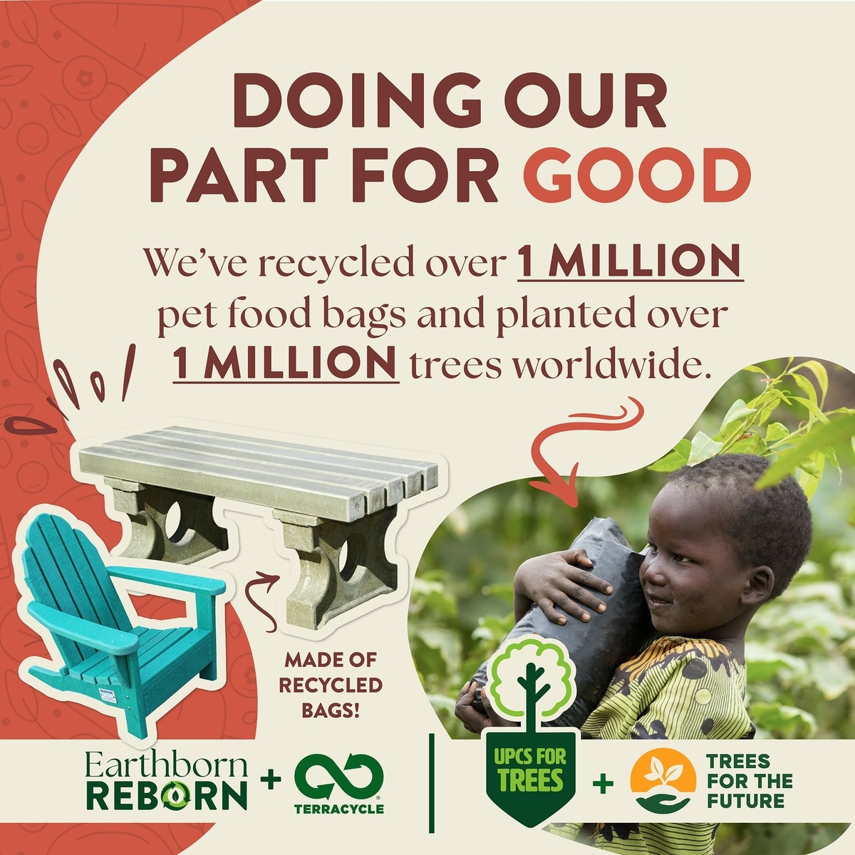 Earthborn Holistic combines their love of dogs with a passion for the environment. They created their UPCs for Trees program to raise awareness and help deforested areas worldwide. Their partnership with Trees for the Future has allowed more than 1 million trees to be planted, putting thousands of people on a path out of hunger and poverty. They also partner with TerraCycle to make their packaging recyclable at drop-off locations—over 1 million pet food bags have been recycled so far!