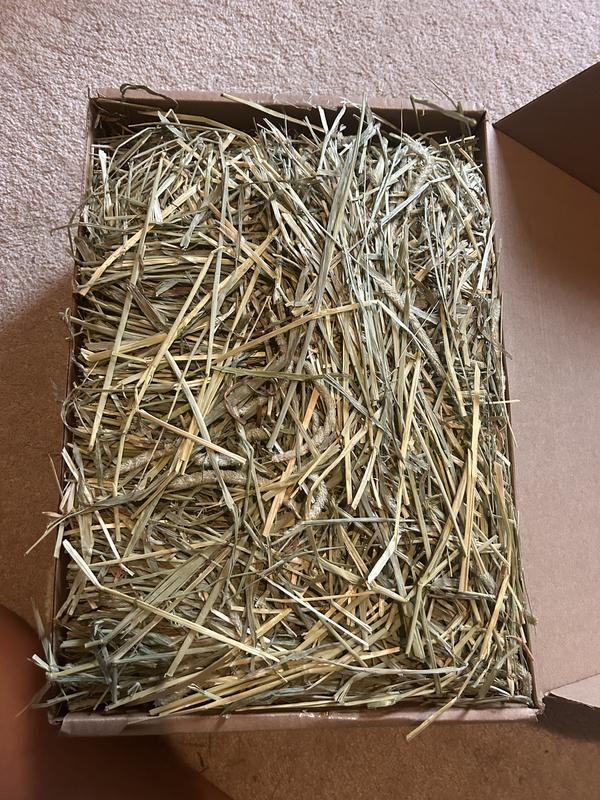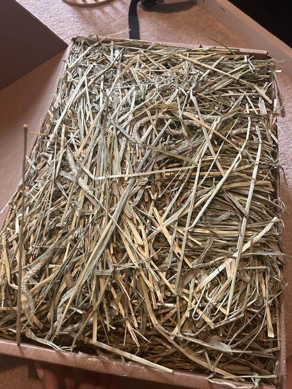 The hay arrived in a box, and when I opened it, the hay was nicely layered in the box. The hay looks clean and healthy. I took a bunch for my bunny, Leo, and he