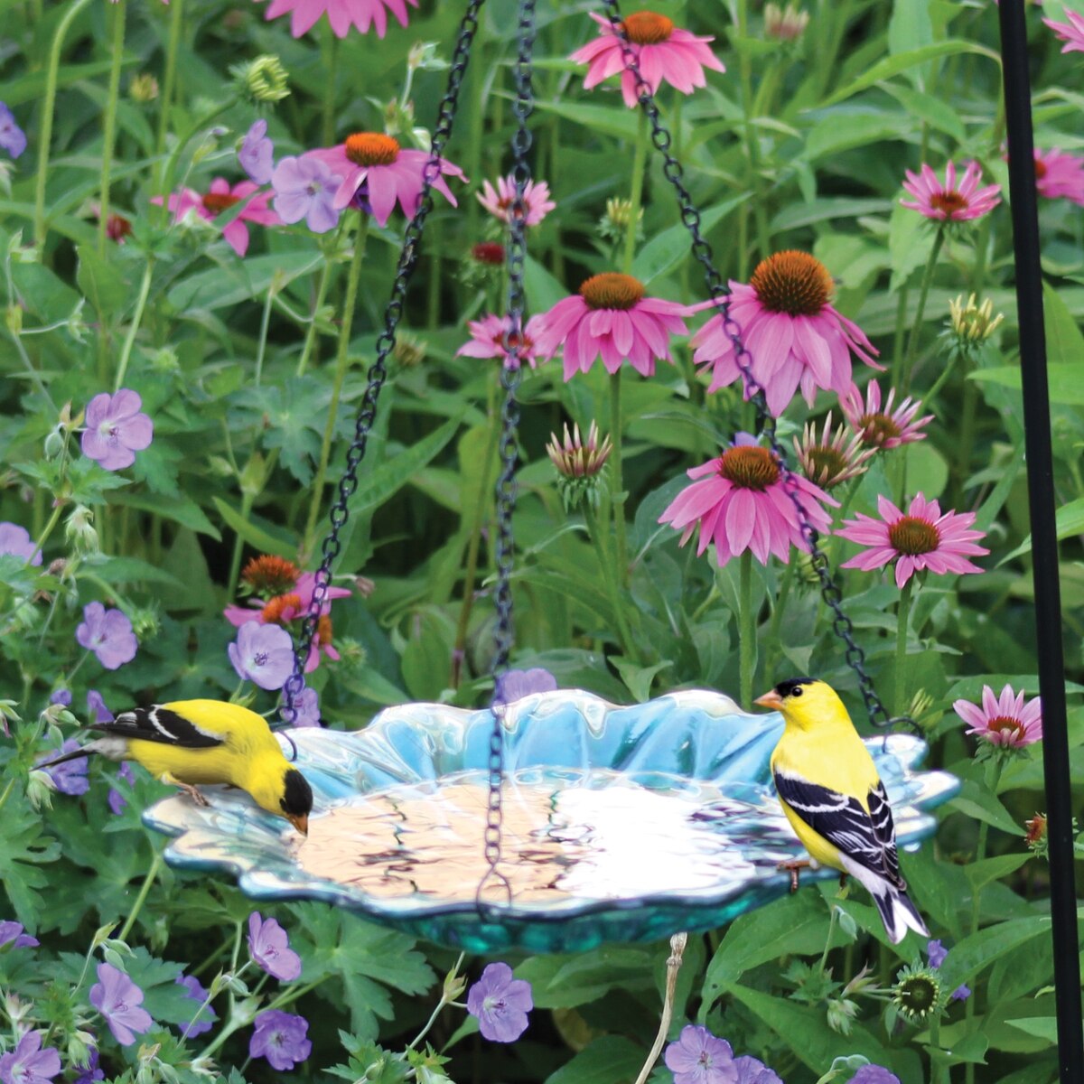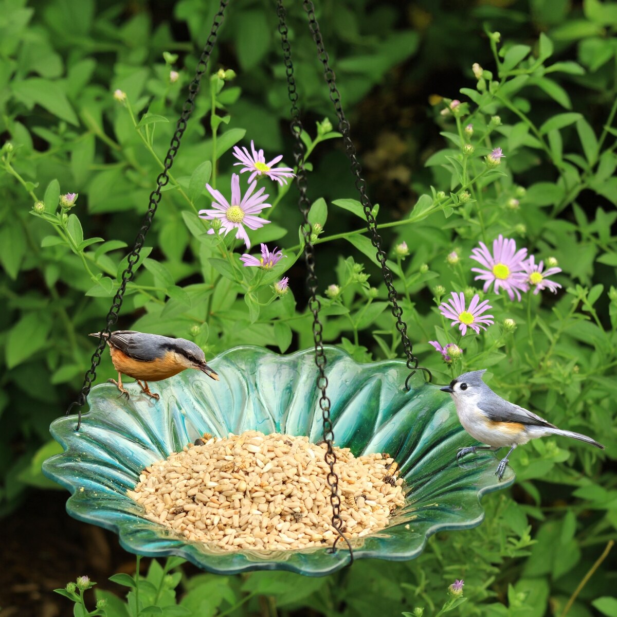 EcoCycle Recycled Glass Hanging Combination Songbird Feeder & Bath, 11-in, 0.625 quartz, Turquoise Dahlia