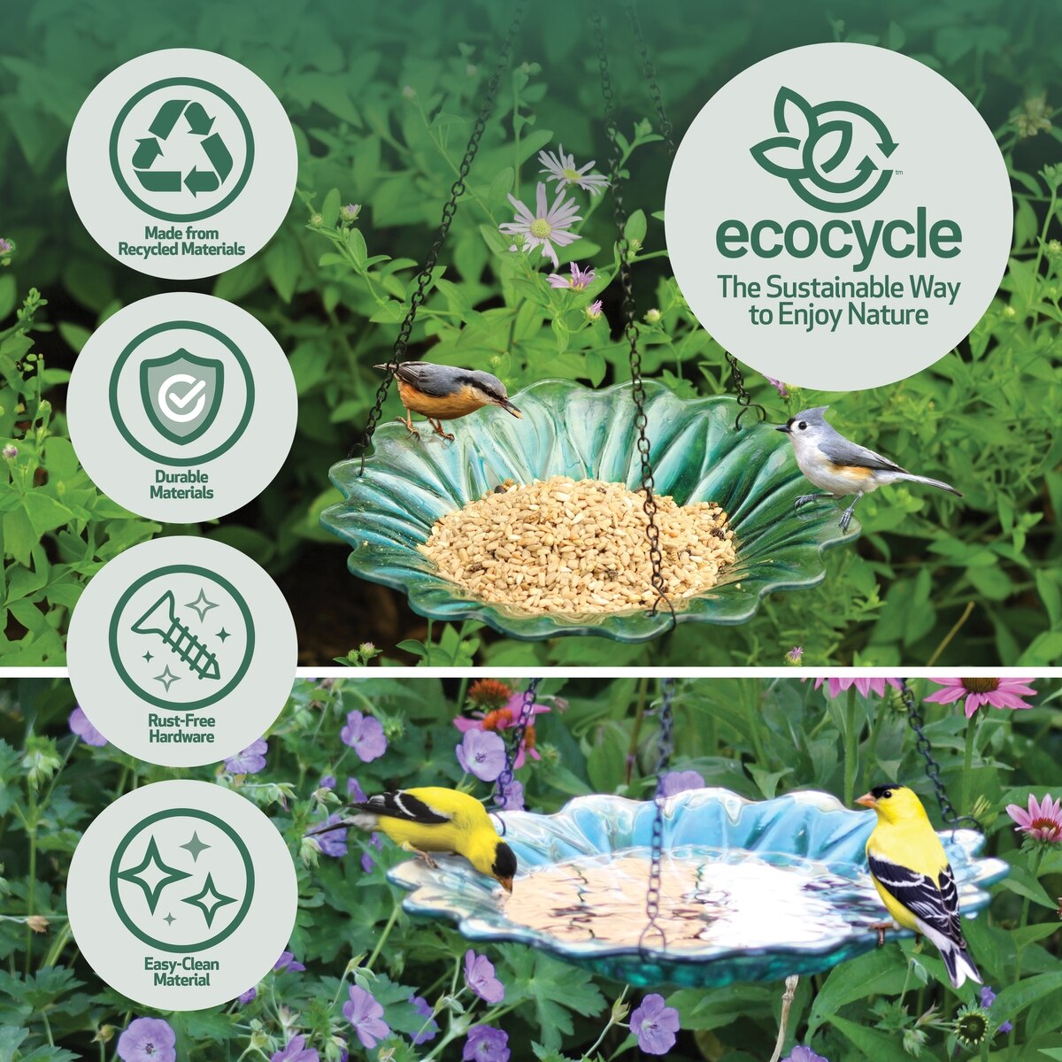 • This feeder and bath combo is made with recycled glass materials for a sustainable birding choice.
