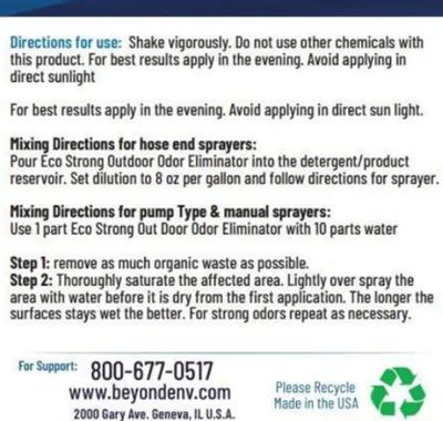 Yard Odors Gone, the First Time Simply spray EcoStrong Outdoor Odor Eliminator onto any water-safe surface and leave it to dry. The formula’s natural odor counteractants offer instant relief from foul smells, while billions of non-pathogenic bacteria and enzymes consume sour odors.