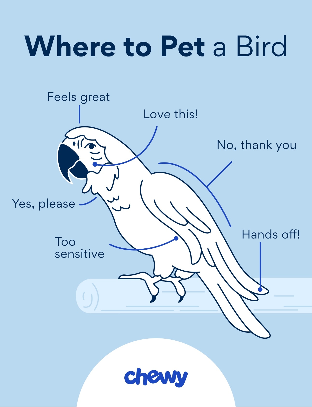 - Start by petting your bird. Remember, restrict petting to only the feathers on your bird’s head, face, and neck.