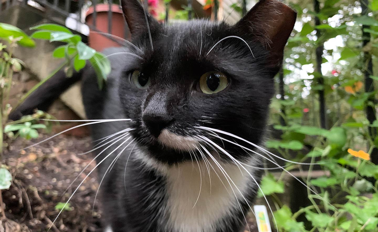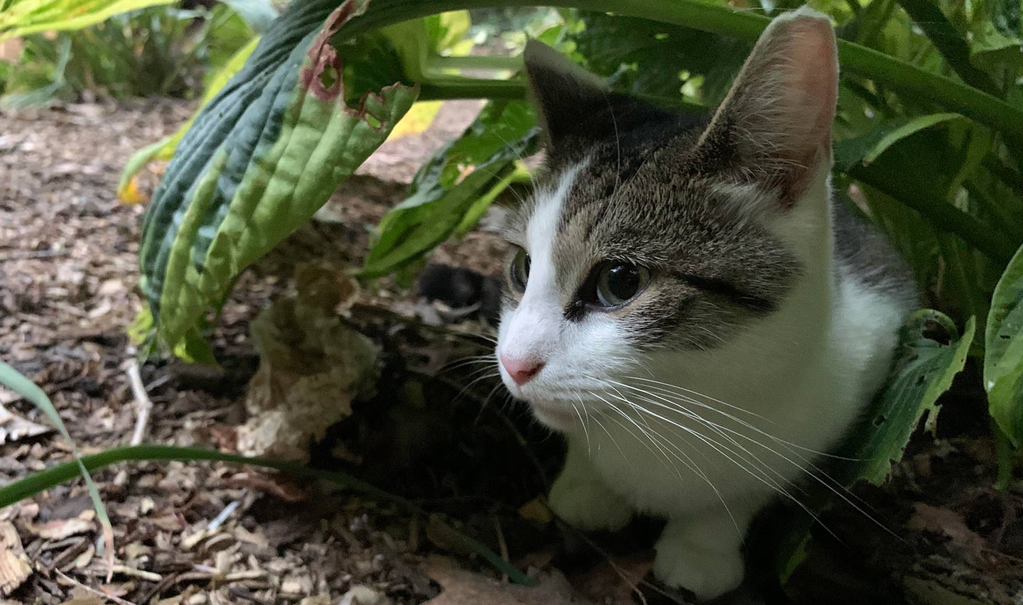That’s exactly what drew Cullen to the working cat program: the promise of an eco-friendly solution to her mole problem. With her admittedly limited knowledge of cats, Cullen says she wasn’t sure what to expect from Lucy and Linus, who were both timid and uninterested in human interaction when they first arrived. Following the recommendations of the Humane Animal Rescue, she kept the cats in a crate outside near her patio for several weeks to let them adjust to their new environment and adopters. Many working cats programs recommend keeping newly arrived cats in an extra-large dog crate with food, water, and litter inside, as well as a small box where the cats can hide and feel safe while they adjust to their new surroundings. Their pet parents place the crate in an area safe from predators, and provide protection from sun and rain with a cover.