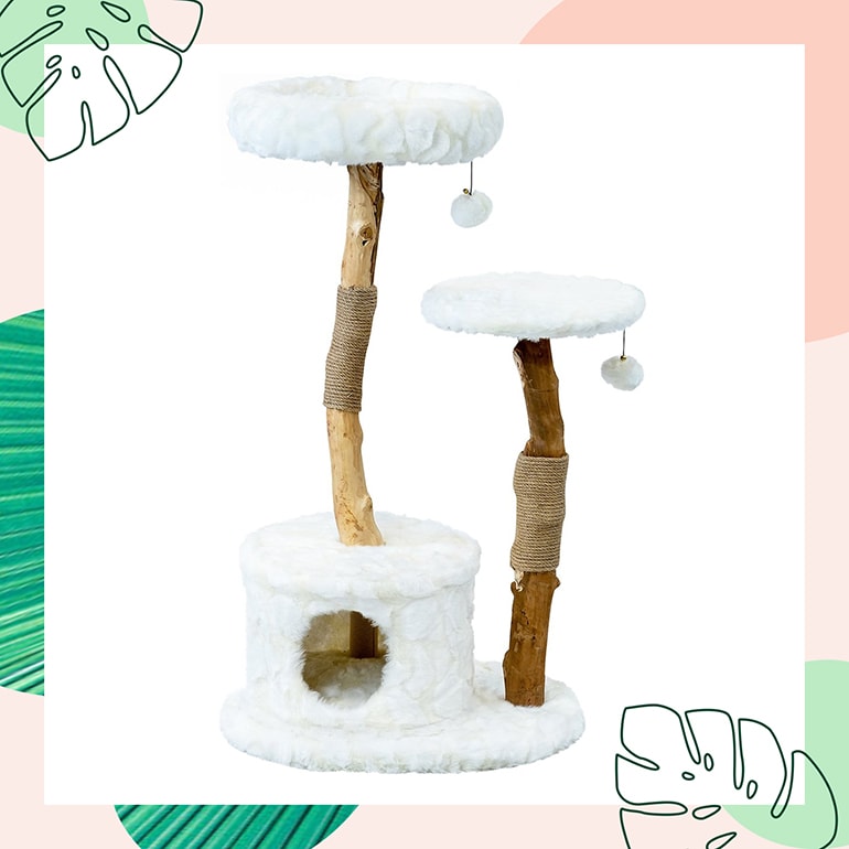 Some cat trees, like the Mau Lifestyle Alba 43-in Modern Wooden Cat Tree & Condo, come with dangling toy mice, hanging ropes, balls, pom-poms, springy wands and other toys attached. Cat trees with toys help keep your kitty entertained when you’re not available to play.