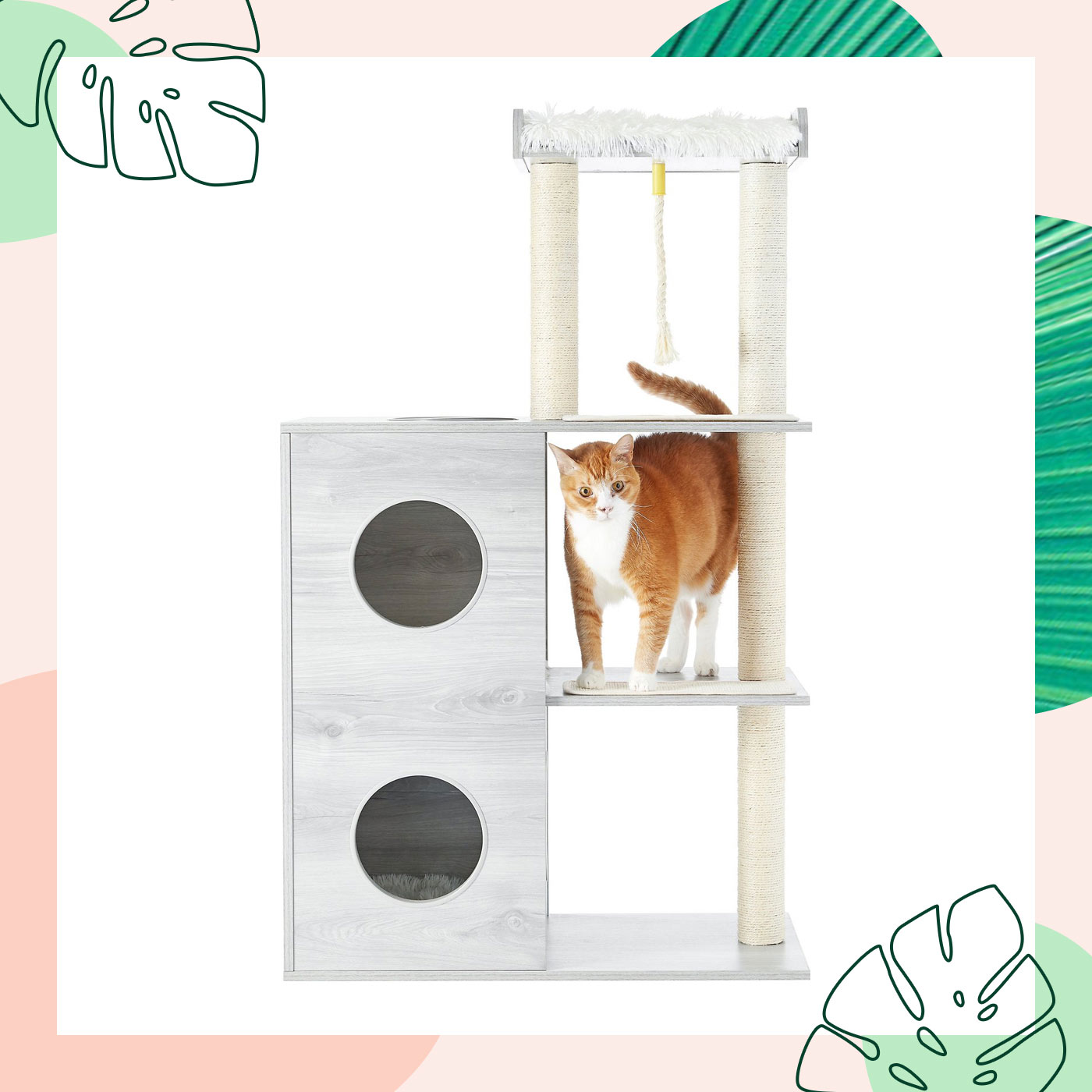 Looking for a cat tree with high marks in both form and function? You’re in luck. There are plenty of unique, upgraded designs that can fit perfectly into your home décor. Some wooden cat trees, like the Frisco 52-in Modern Cat Tree & Condo, show off their wood grain or incorporate walnut laminate finishes. They also tend to have cleaner lines that blend into a midcentury or contemporary home design. Other modern cat trees, like the On2Pets Large Square Modern Cat Tree, take a more organic approach, with designs mimicking tree branches.