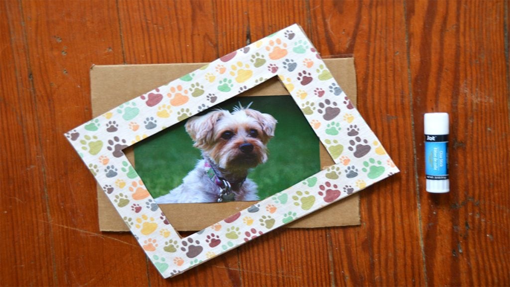 - Glue the two pieces of cardboard together—ensuring that the photo is visible through the border and that the scrapbook paper side is on top.