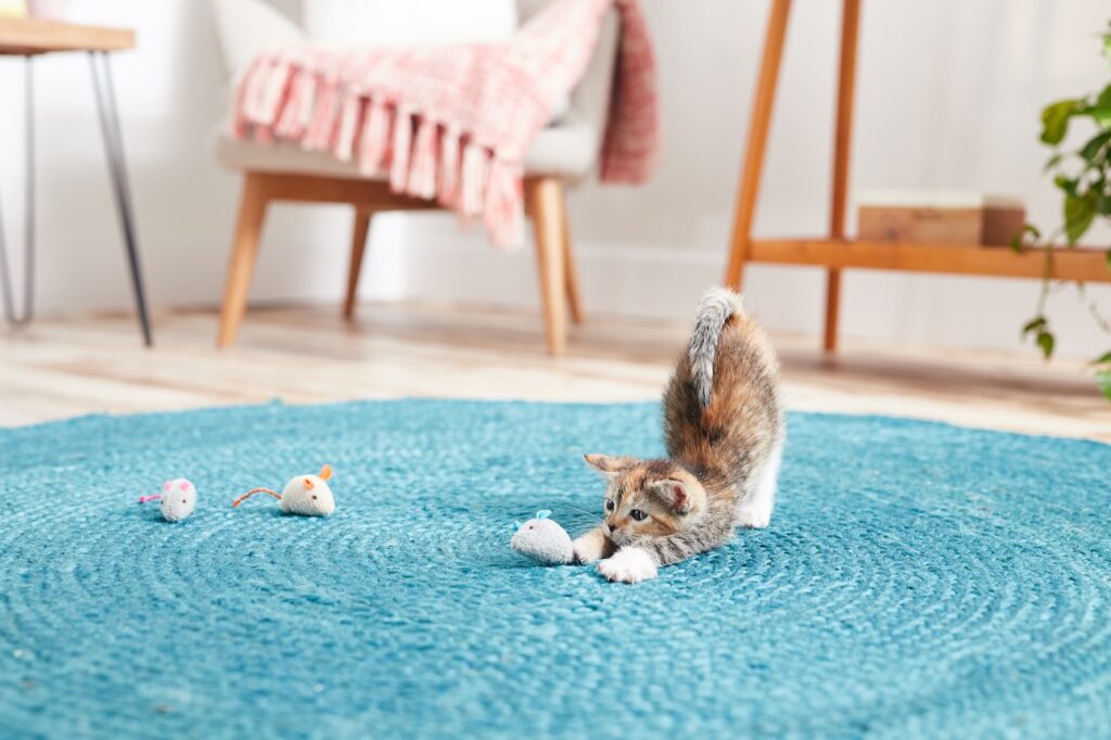 Plan on playing with your kitten at least four times a day using feather wands, balls, and other cat toys. This isn’t as daunting as it might sound because play sessions can be short—two to three minutes at a time is fine.