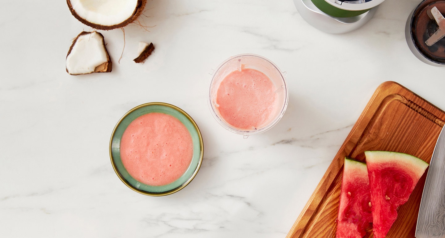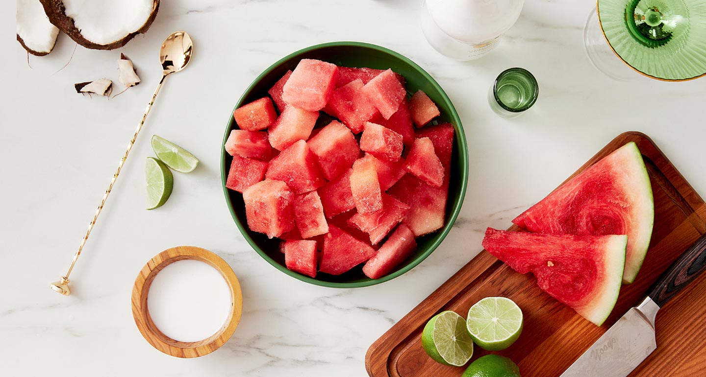 - Add frozen watermelon and coconut milk to a blender and pulse until it reaches a slushie consistency. Pour into a cocktail glass.