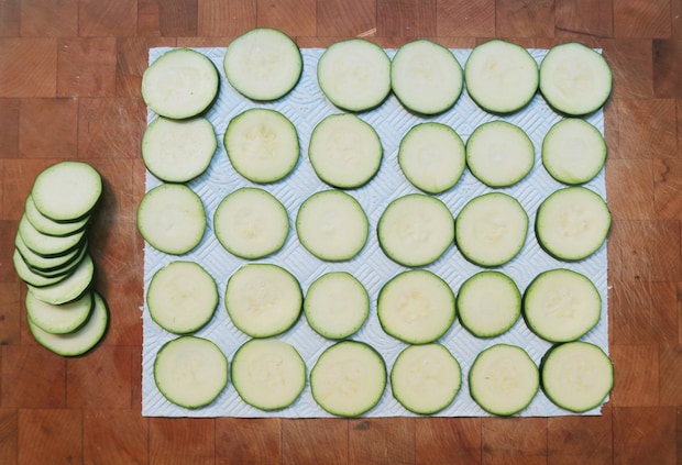 Wash the zucchinis and slice them into rounds. I used a mandolin on the thickest setting but you can also cut them by hand with a kitchen knife. The key is to get the slices even thickness so they all come out perfectly crunchy.
