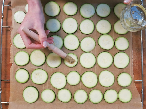 Place the zucchini slices in a single layer on a sheet of baking paper. Brush with a little egg white, you don’t need to use a lot.