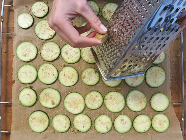 Grate the freeze dried dog treats over the zucchini slices (watch your fingers!)