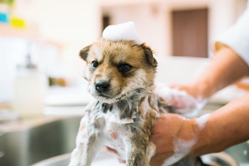 If the puppy has fleas, for safety’s sake use a natural dog flea shampoo rather than harsh chemicals to get rid of those unwelcome visitors.