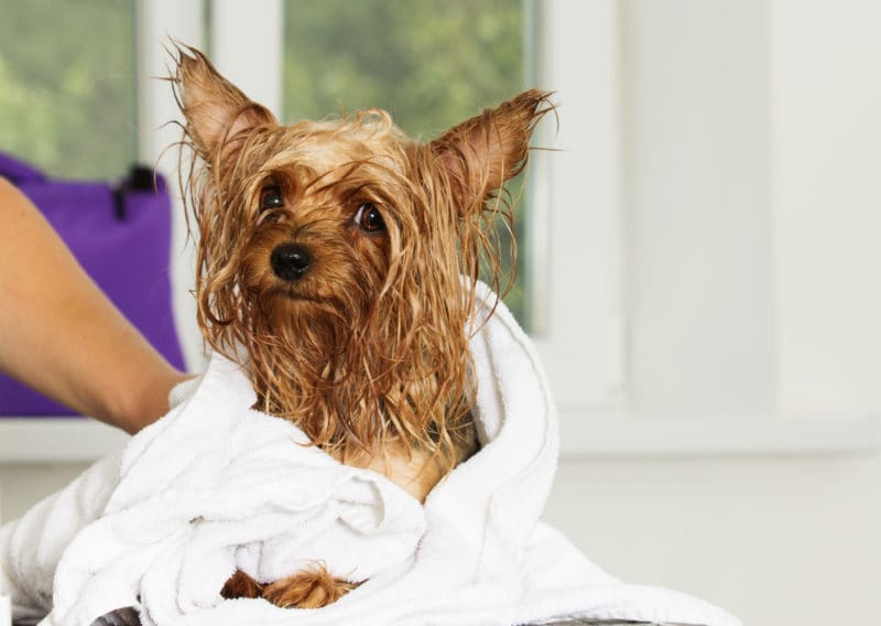 Most puppies can be bathed right in the kitchen sink. Place them on a rubber mat to prevent slipping and using the dish-spray hose or a hand-held shampoo attachment used for travel, wet them down from the back end with a gentle spray so they won’t panic.