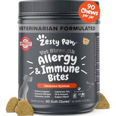 - Zesty Paws Vet Strength Allergy & Immune Bites: These chews are vet-formulated and are best for pet parents looking for an option with additional allergy-fighting ingredients. It includes fish oil, probiotics, spirulina, astragalus, vitamin C, and other beneficial ingredients known to regulate the immune system.
