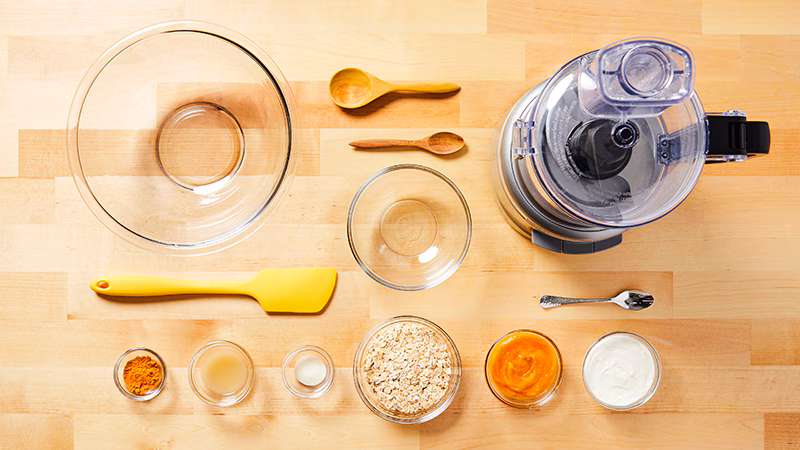 - Place the powdered oats in a large mixing bowl and add the pumpkin, the Greek yogurt and the turmeric powder to the bowl.