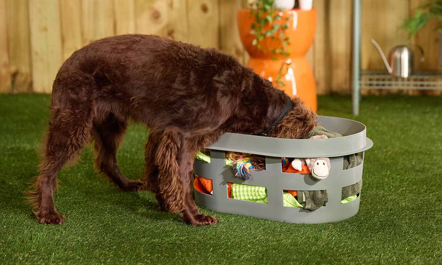 Farrah says, “Make your dog his own little dig pit with a low-sided tub or box full of old towels or toys. Hide his kibble or special treats inside and let him spend some time foraging for his food.” You can also build a sandbox for your pooch to use as a digging spot.