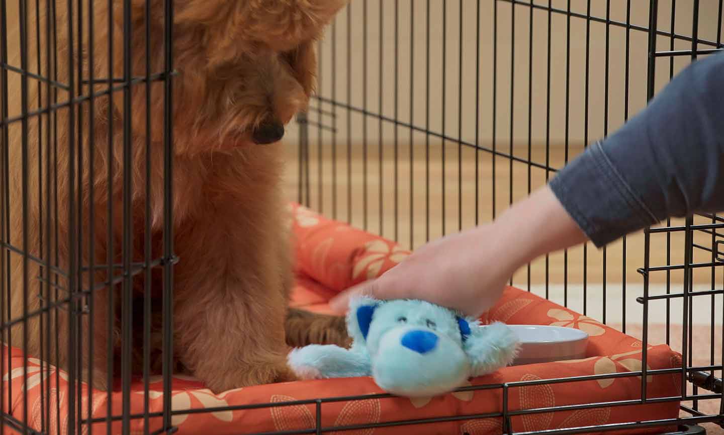 Another sure-fire method: Reward your puppy for going inside the crate! When you catch them hanging out in there, shower them with tasty treats or their favorite toys. Treat-dispensing toys and safe chew toys are ideal for distracting puppies from the fact that they’re alone. (Just make sure to supervise your puppy playing with any new toy, to ensure they can’t chew or break it into pieces that could become safety hazards.)