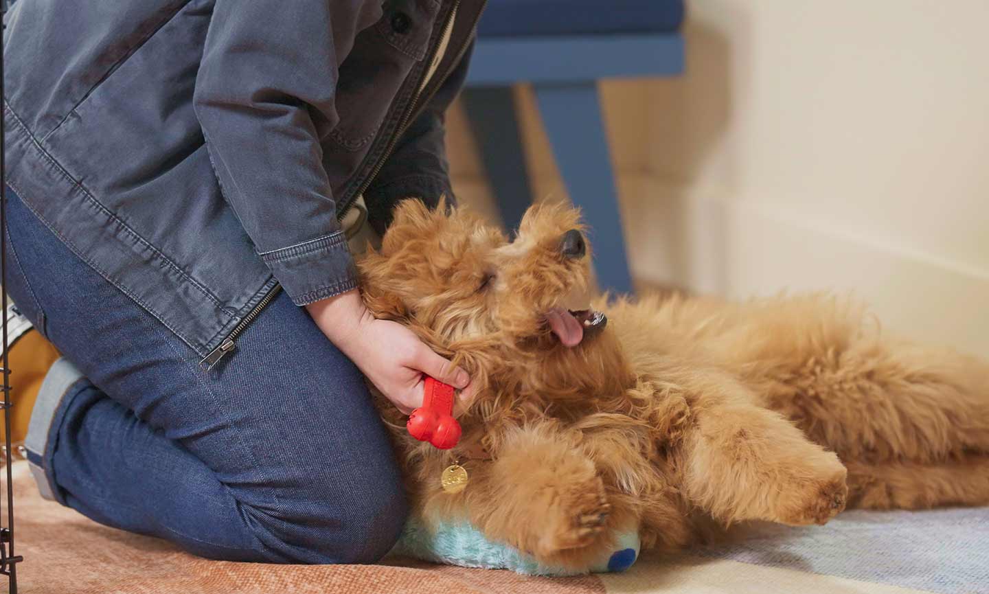 You know what they say: A tired puppy is a happy puppy. A tired puppy is also more likely to sleep than to worry about where you’ve gone. So before crating your dog and leaving the room, you’ll also want to give them lots of attention. Take them for a walk or a vigorous play session—or both!—and of course, make sure they get one final chance to potty before settling into their crate with those yummy toys and treats. Get more tips for calming a high-energy puppy.
